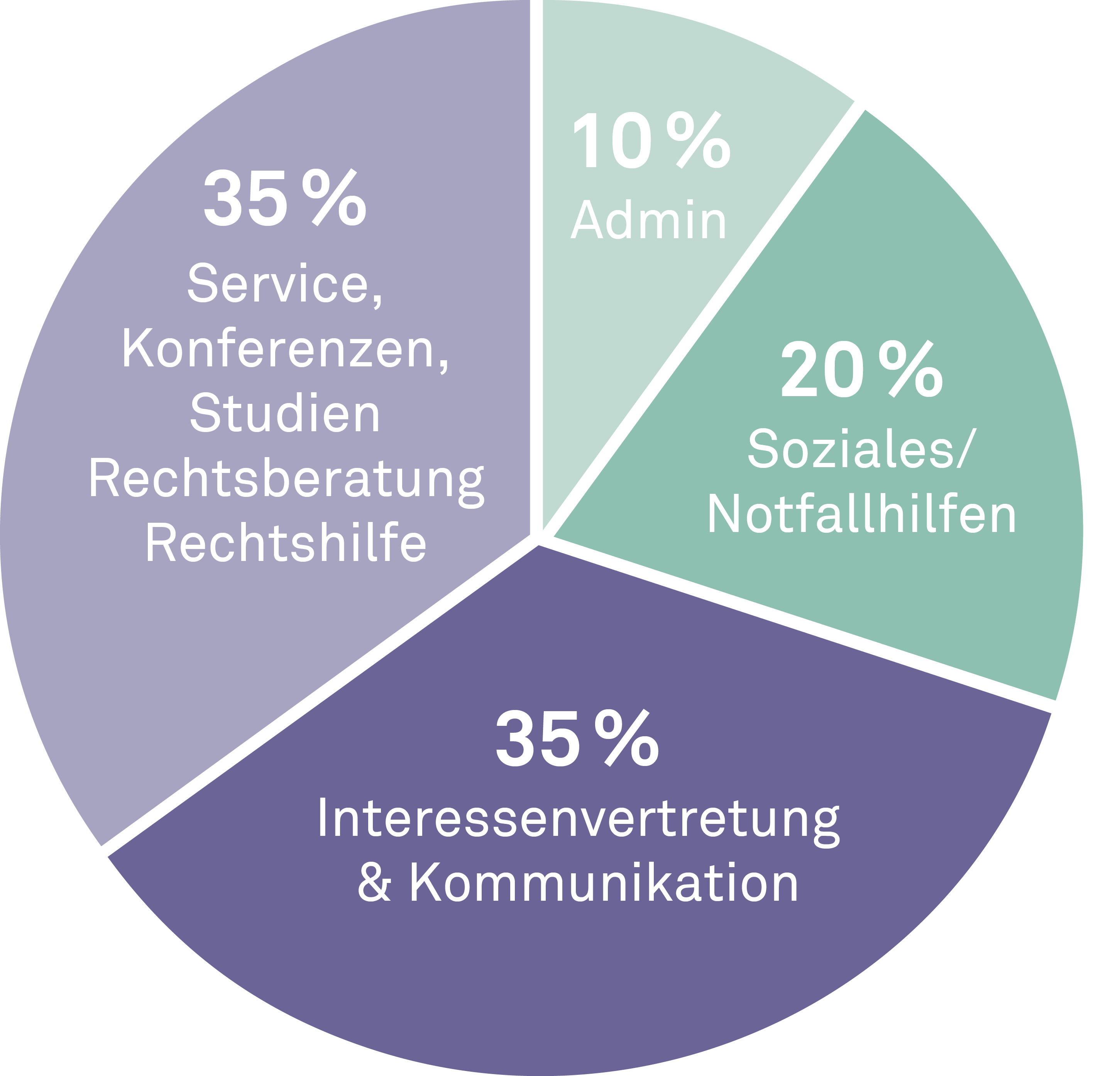 Das Betriebsratsumlagen-Budget ist klar geregelt. Die Betriebsratsumlage wird für Aufga ben der Interessenvertretung, für nützliche Services, für Hilfe in Not für Hilfe in Not, Rechts beratung und Rechtshilfe sowie für Konferenzen und Studien von Kolleg:innen eingesetzt werden (s. Grafik). Regelmäßige Befragungen stellen sicher, dass Services und Angebote konsequent an den Bedürfnissen der Mitarbeiter:innen ausgerichtet werden. Die Verwendung der Mittel wird jährlich von der Betriebsversammlung mit Rechnungsprüfern aus dem Kreis der Mitarbarbeiter:innen und einer externen Kommission der Arbeiterkammer gepüft. Eine persönliche finanzielle Begünstigung von Betriebsratsmitgliedern ist dabei ausgeschlossen. Nur zweckgebundene Leistungen für Mitarbeiter:innen (z. B. Sozialfonds) sind erlaubt.